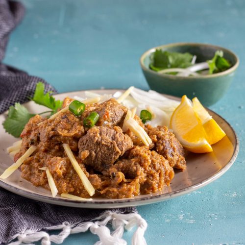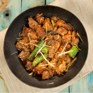 Succulent mutton pieces cooked in a rich, flavorful gravy with a blend of traditional spices, slow-cooked in a wok (karahi) for an authentic taste. Served with aromatic garnishes, this hearty dish is perfect for sharing.