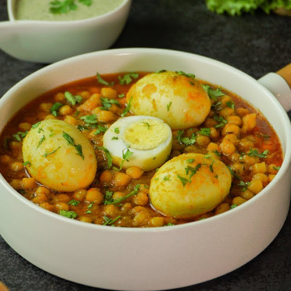 A flavorful dish featuring chickpeas cooked in a spiced gravy, topped with perfectly fried eggs, creating a hearty and satisfying meal. Often garnished with fresh coriander and served with naan or rice.