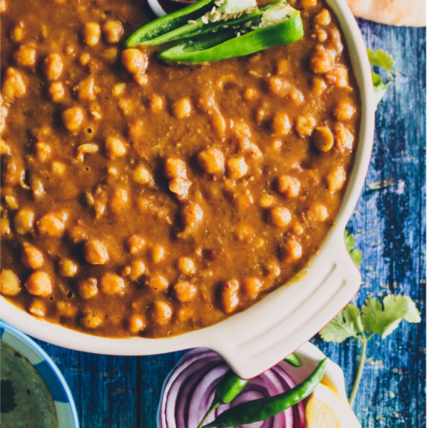 A traditional and flavorful dish made with chickpeas, simmered in a blend of aromatic spices, tangy tamarind, and a hint of heat, offering a hearty and savory taste. Often served with naan or rice for a complete meal