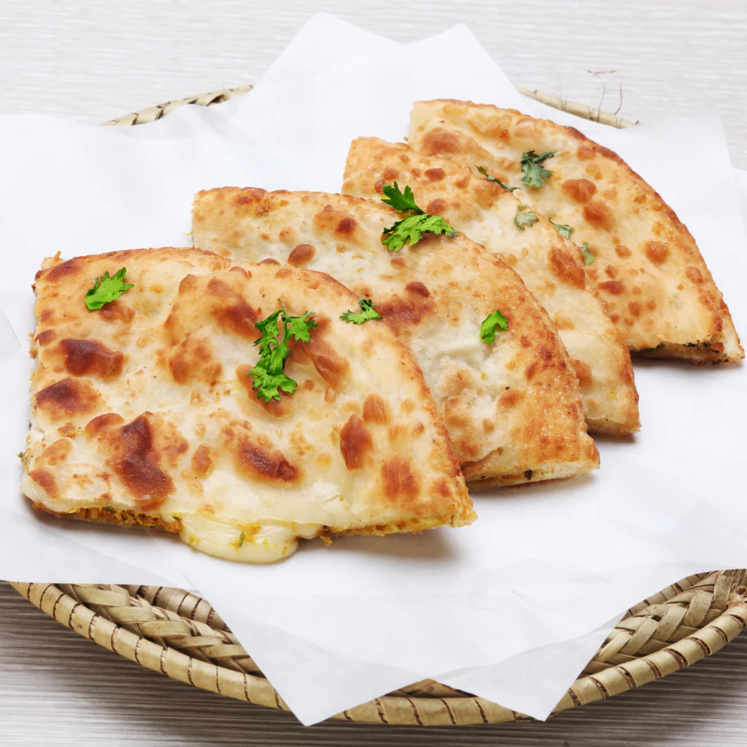 A deliciously stuffed paratha with spiced chicken and melted cheese, creating a perfect blend of savory and creamy flavors in every bite.