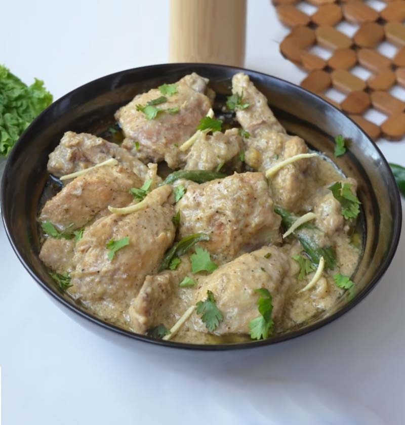 Tender pieces of chicken or mutton cooked in a creamy, mild white gravy made with yogurt, cream, and aromatic spices, creating a rich and flavorful dish.