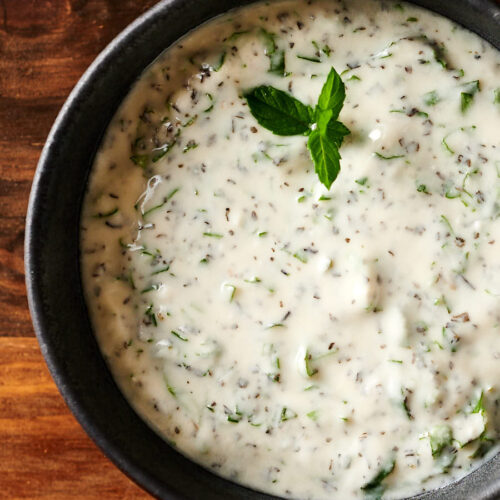 A cooling yogurt-based dip flavored with fresh mint, cumin, and a touch of salt, offering a refreshing contrast to spicy dishes.